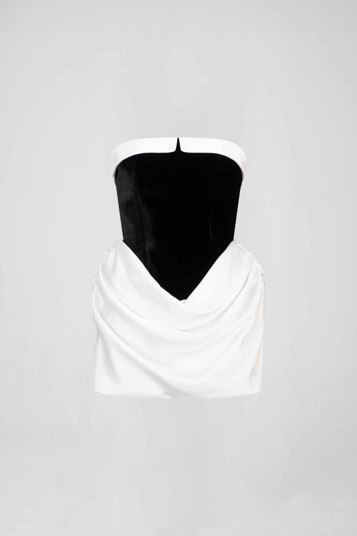 The Aubrey Mini features a micro length skirt balanced with exaggerated draping across the hips to build on the silhouette. A corset style bodice structures the waist in contrast velvet fabrication.