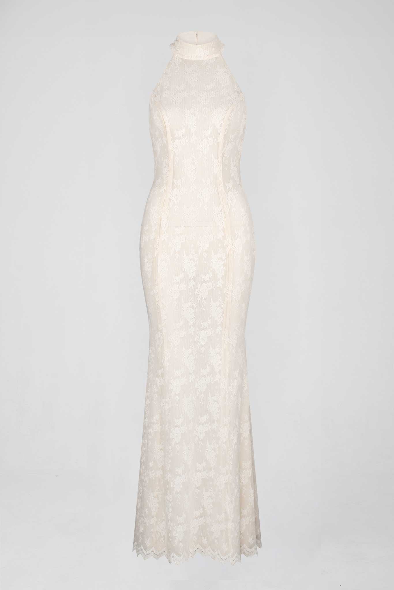 The Devon Gown is a halter neck maxi dress with a subtle fit and flare hem. A low back detail opens the design to feature pearl straps draping across the upper back.