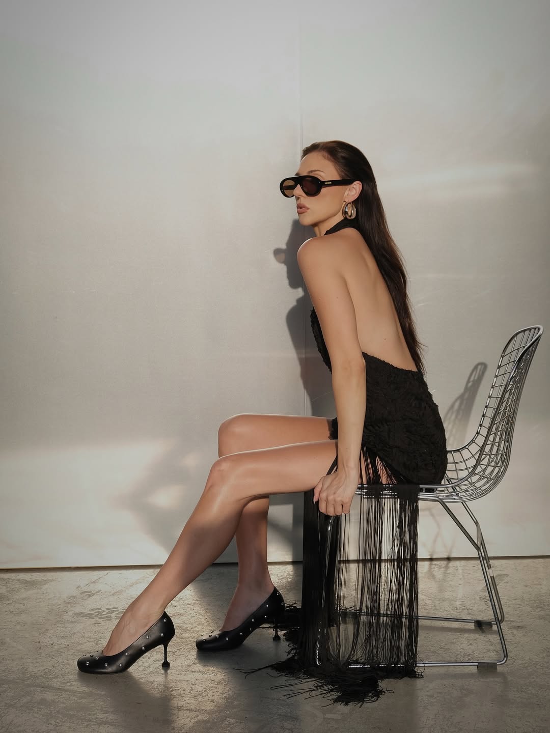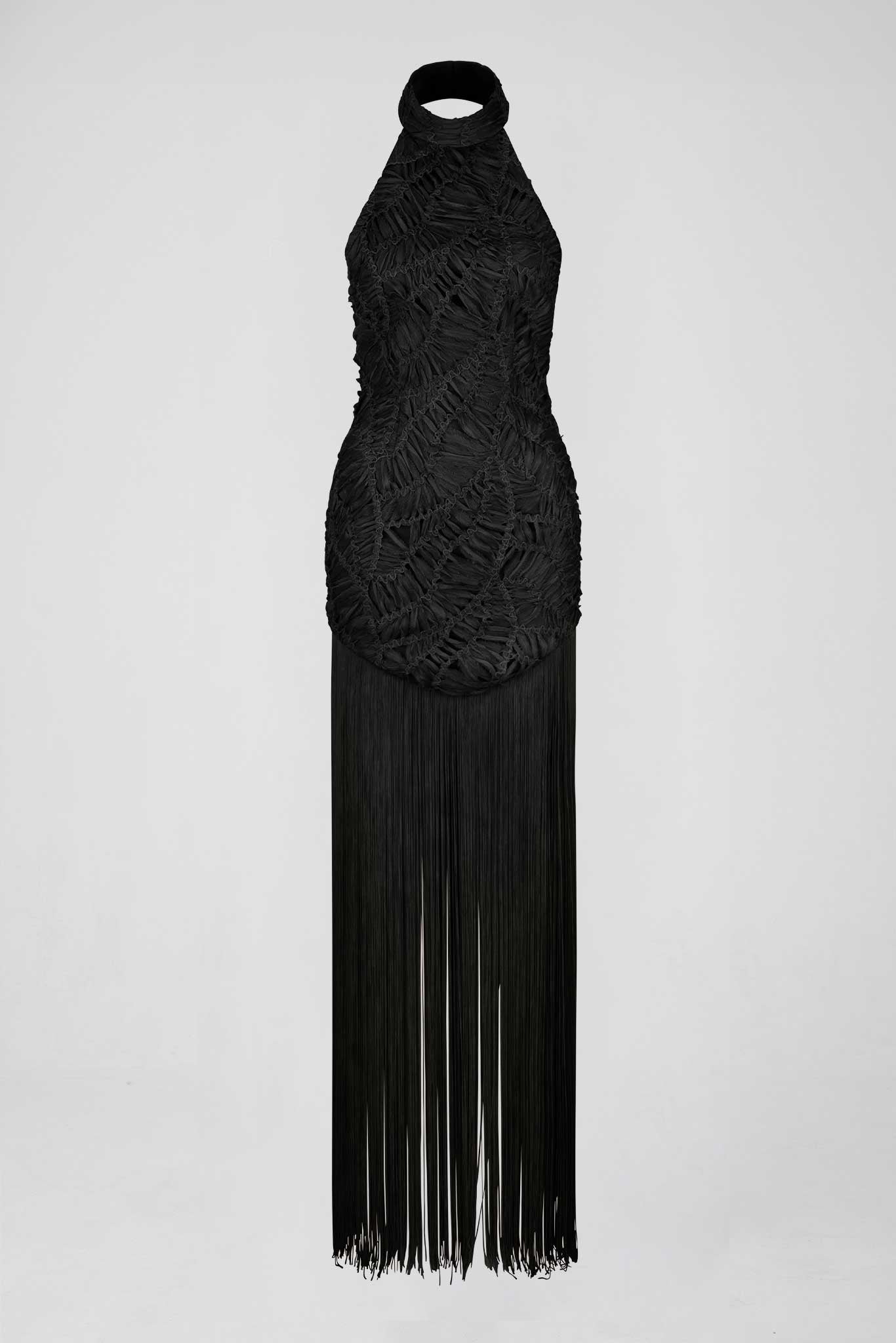 • The Elle Gown is a halter-style with a low back line and long line hem tassel detailing. A centre back invisible zip at the back waist and self buttons at the neck offer a refined finish. This style is lined at the bodice and unlined at the tassel hem.