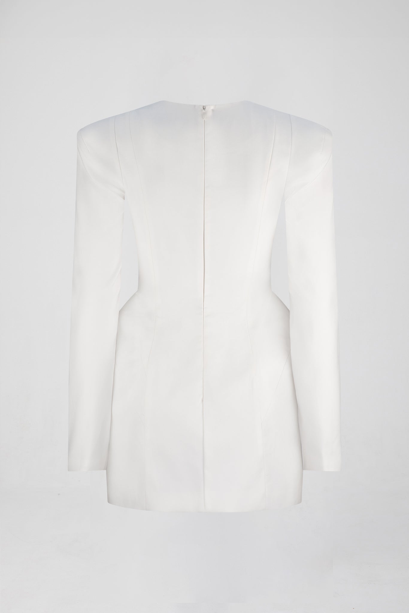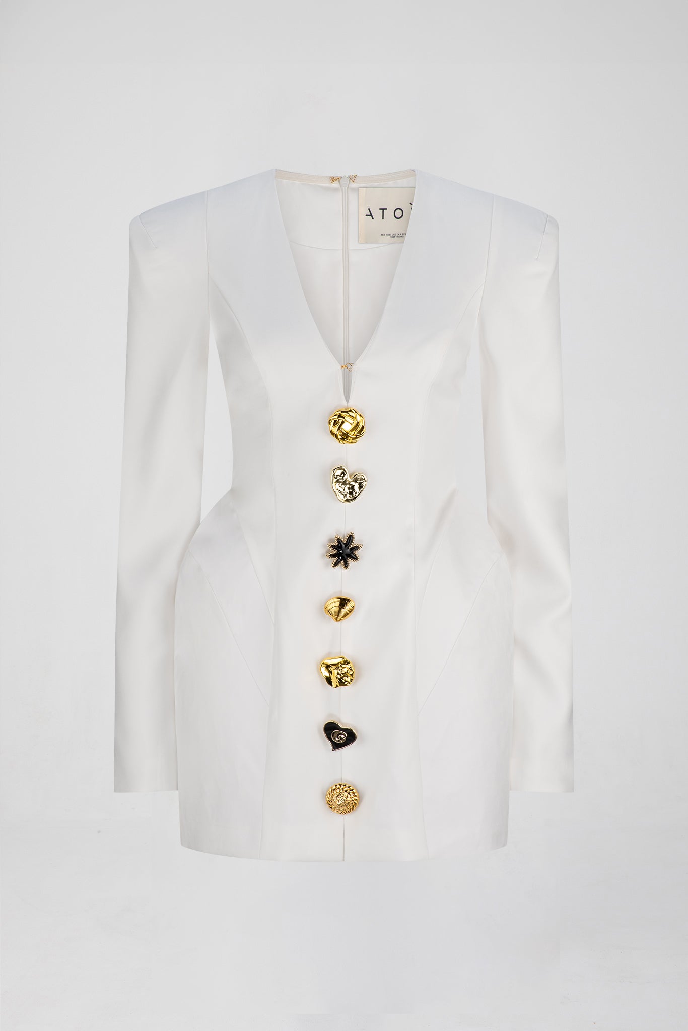 The Florence Dress is a tailored mini, featuring an exaggerated hip and oversized shoulder for a structured silhouette. The Florence has been designed into a structured ivory fabrication and finished with a mix of vintage inspired gold hardware running down the centre front. An invisible centre back zip facilitates a seamless wear.