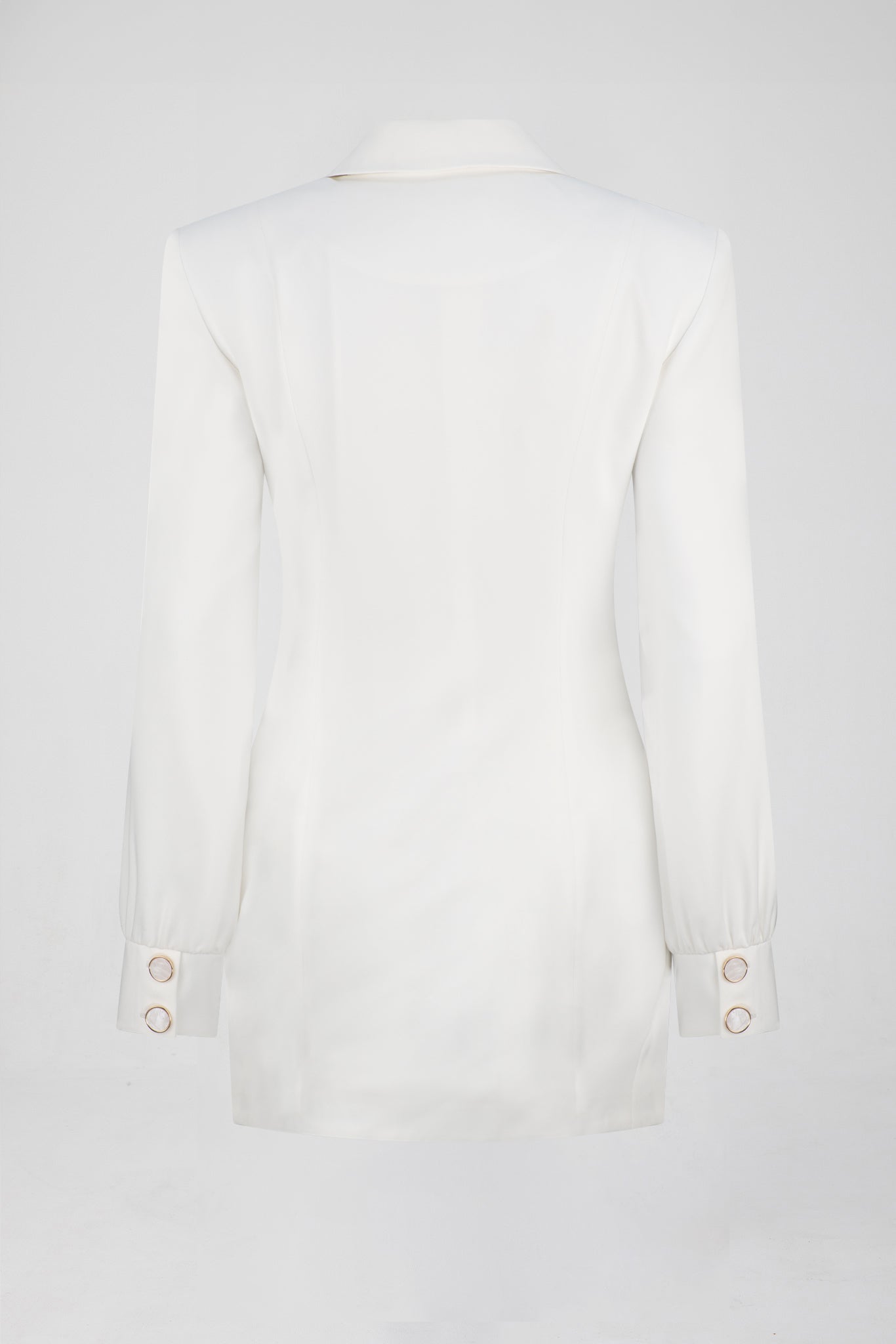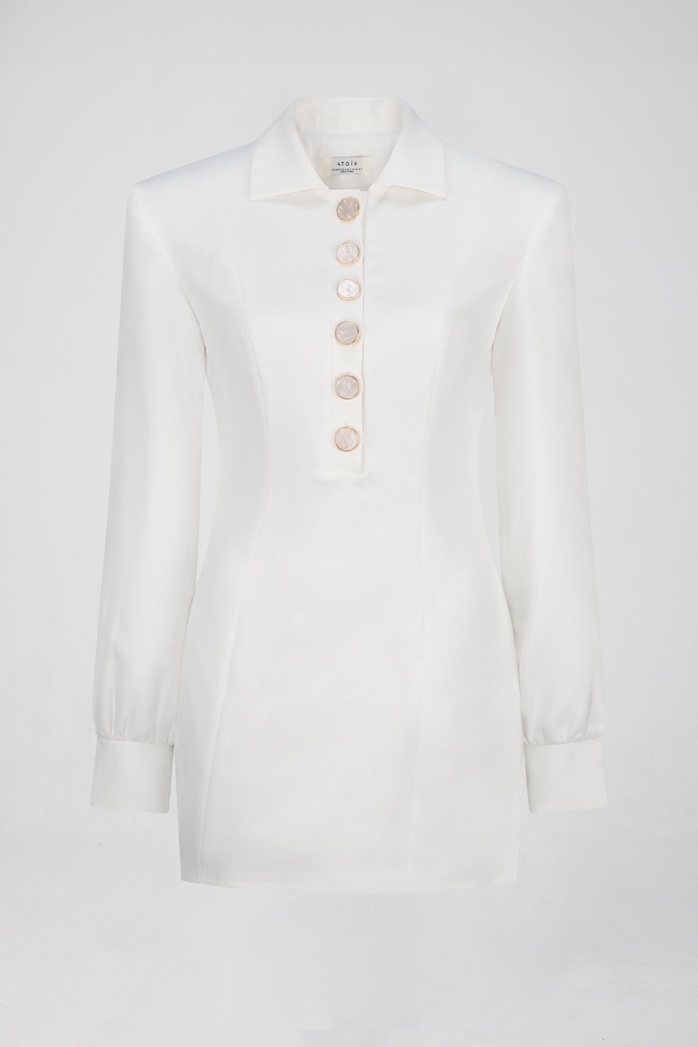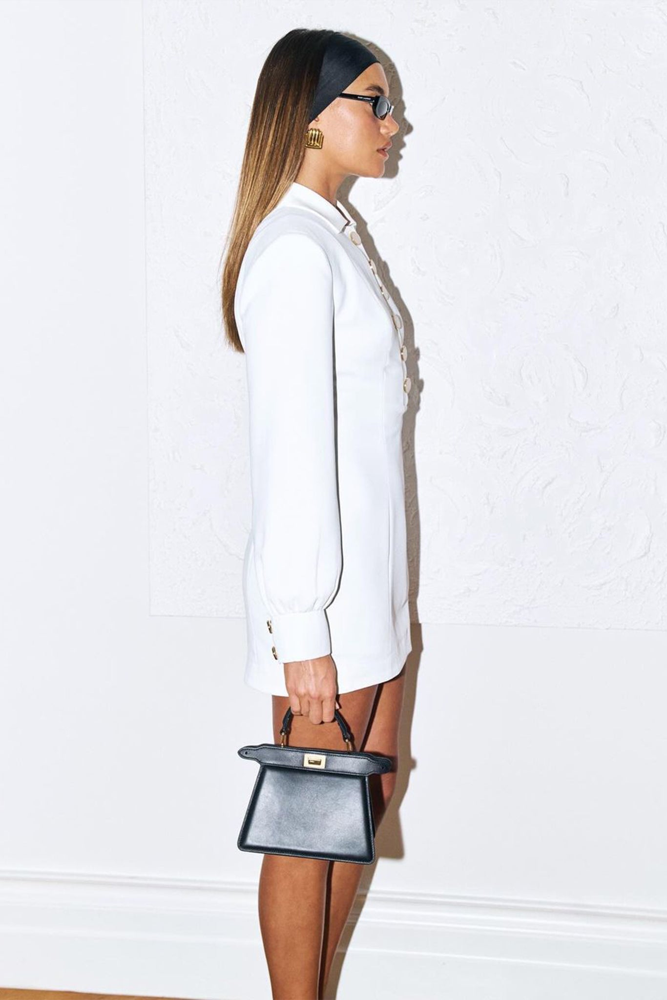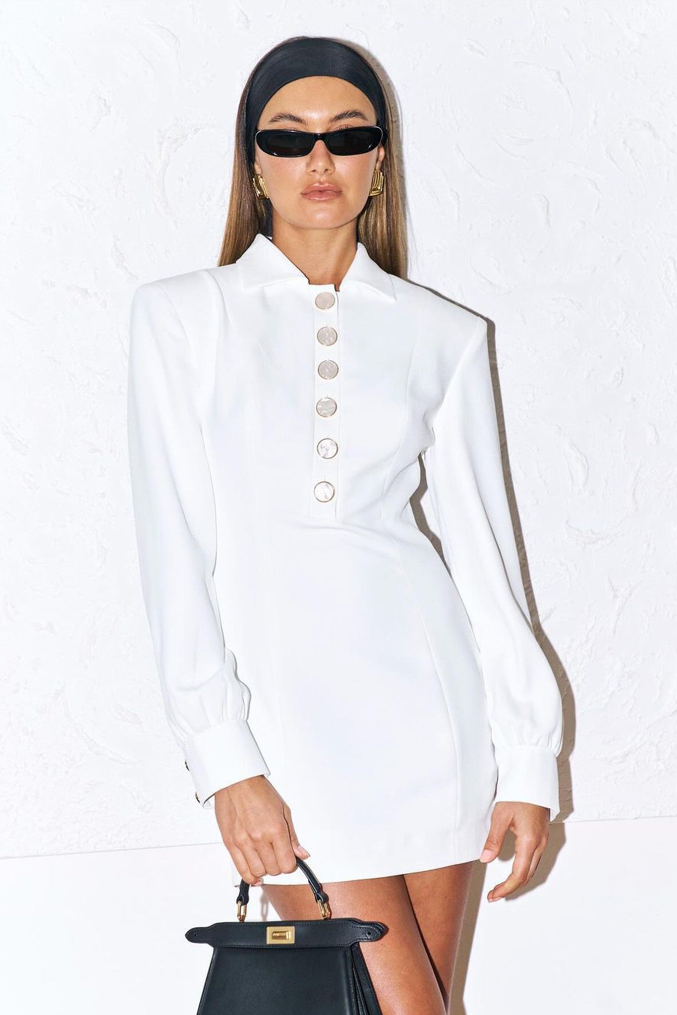 The Goldie Mini was seen this Spring Carnival on @edenkannourakis. The Goldie is a classic, collared, long-sleeve mini. Designed into a soft ivory fabrication with vintage pearl finish buttons at the centre front.