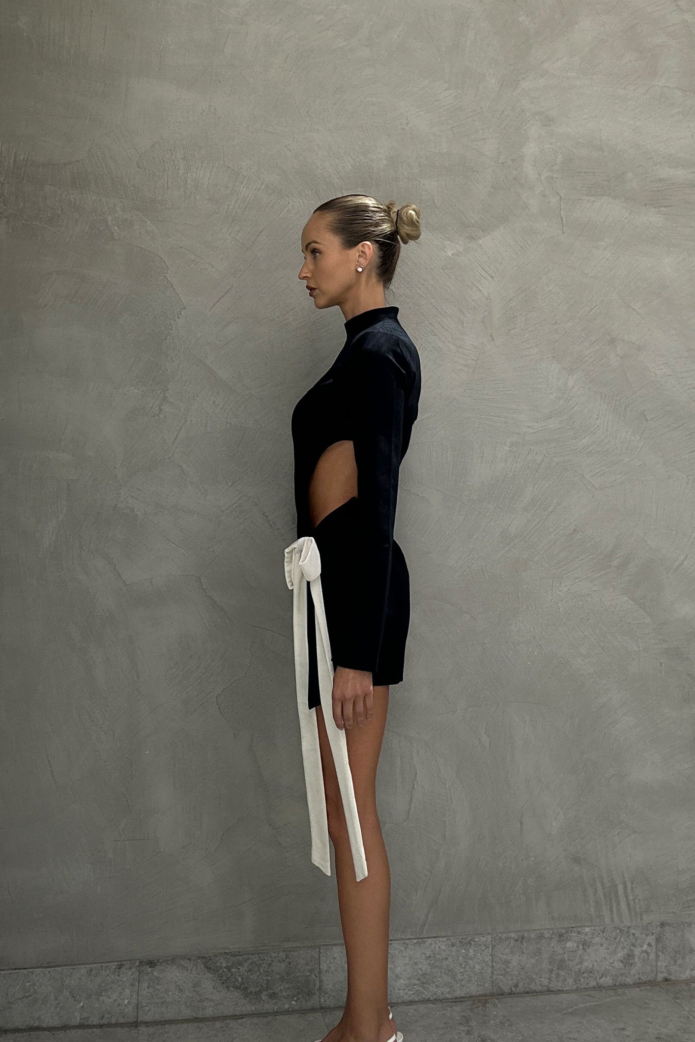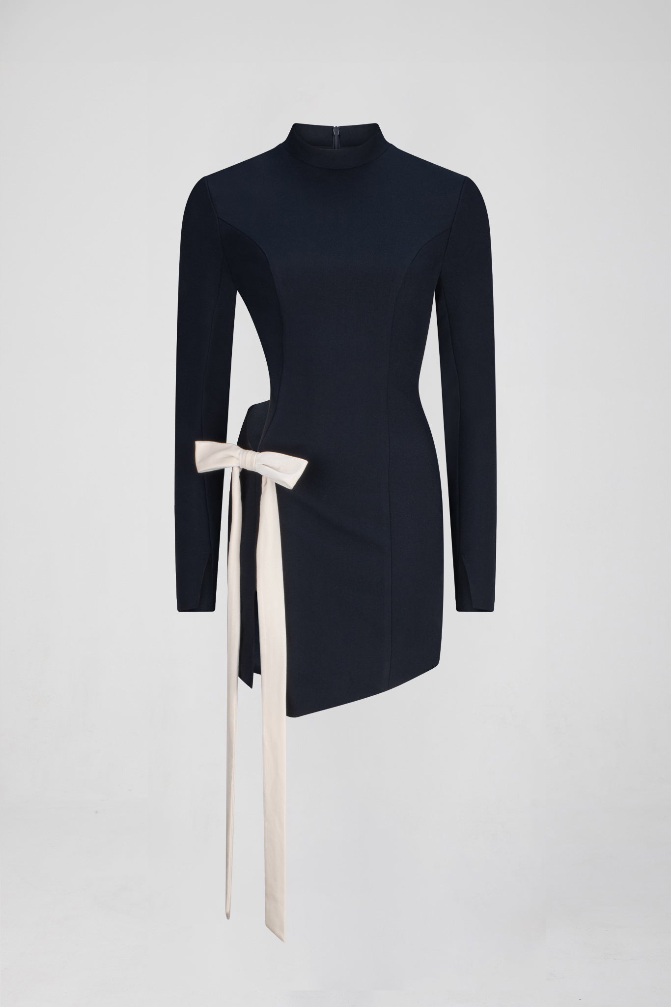 The Pia Mini arrives in a sartorial navy hue, featuring a contrast ivory, velvet finish bow applique. An asymmetric cut out around the back and side waist adds edge to this long sleeve, mock neck silhouette.