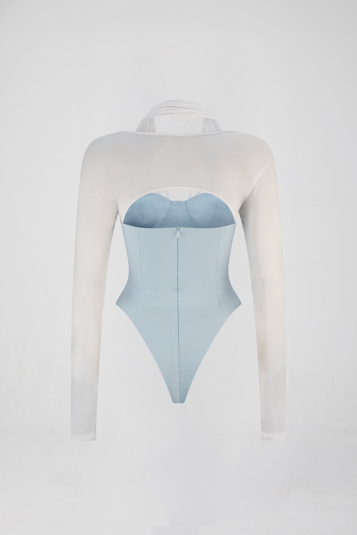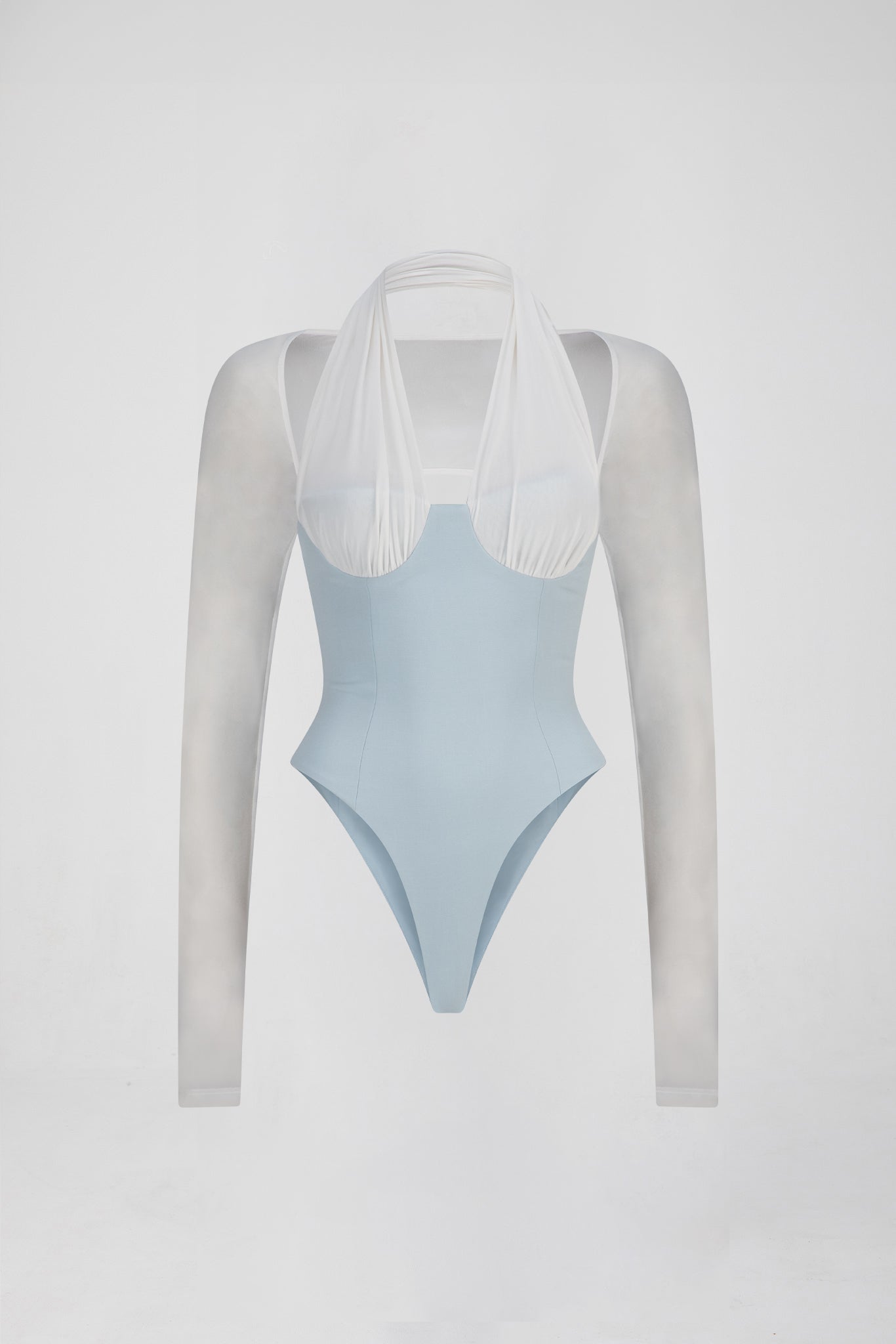 The Polly Bodysuit features a mesh contrast fabric across the bust and sleeve. A halter neck detail elevates a classic silhouette, with cut away detailing at the back.