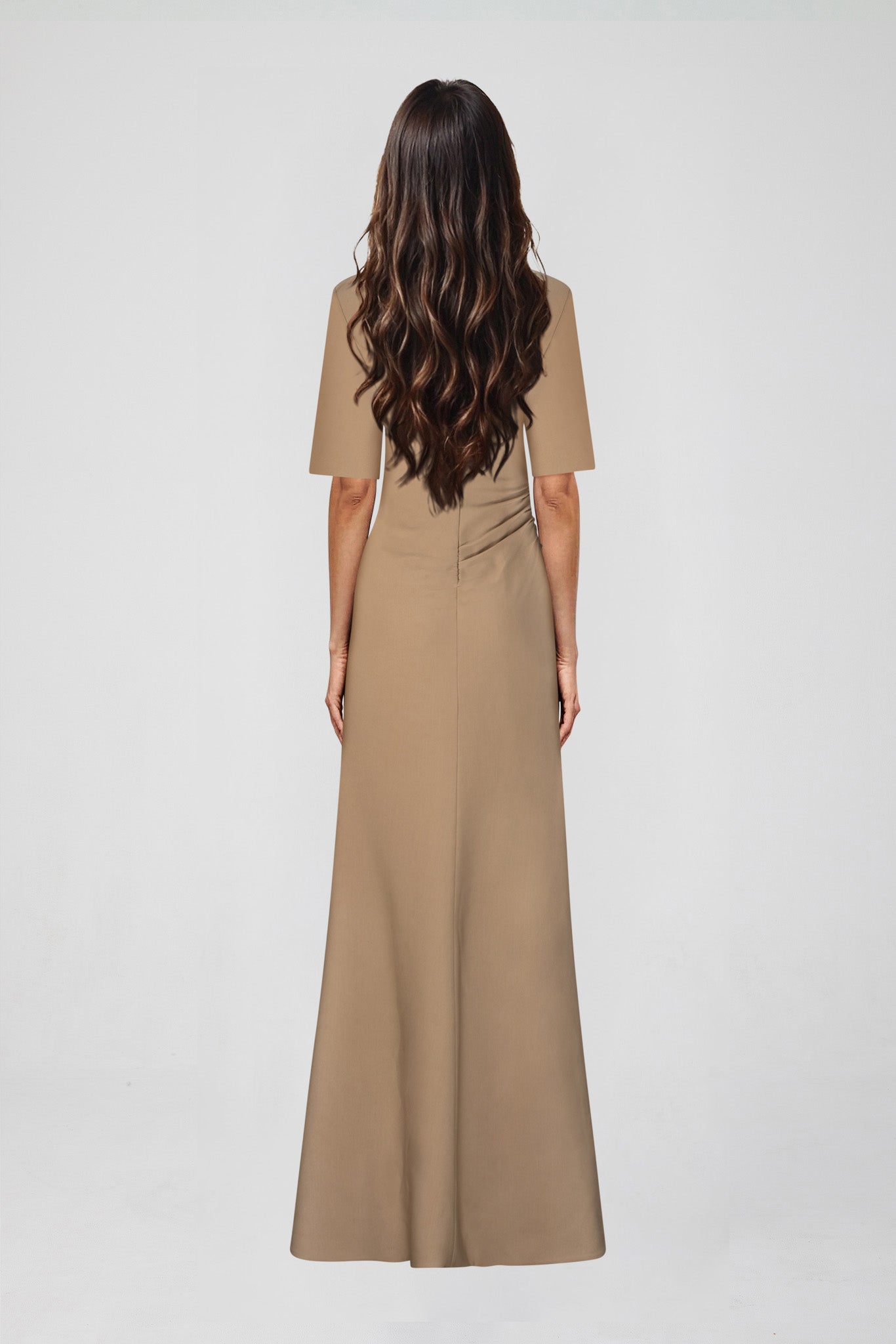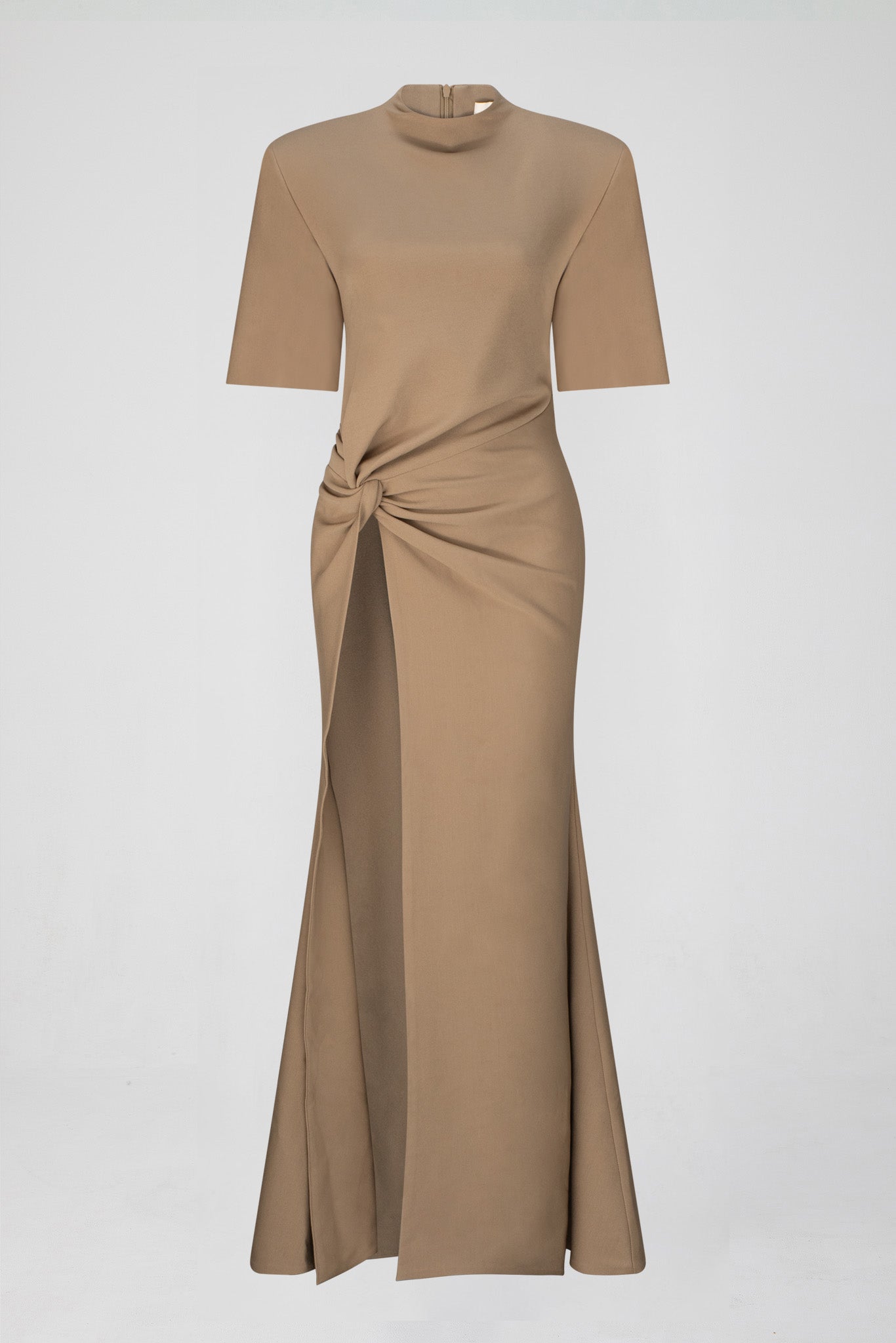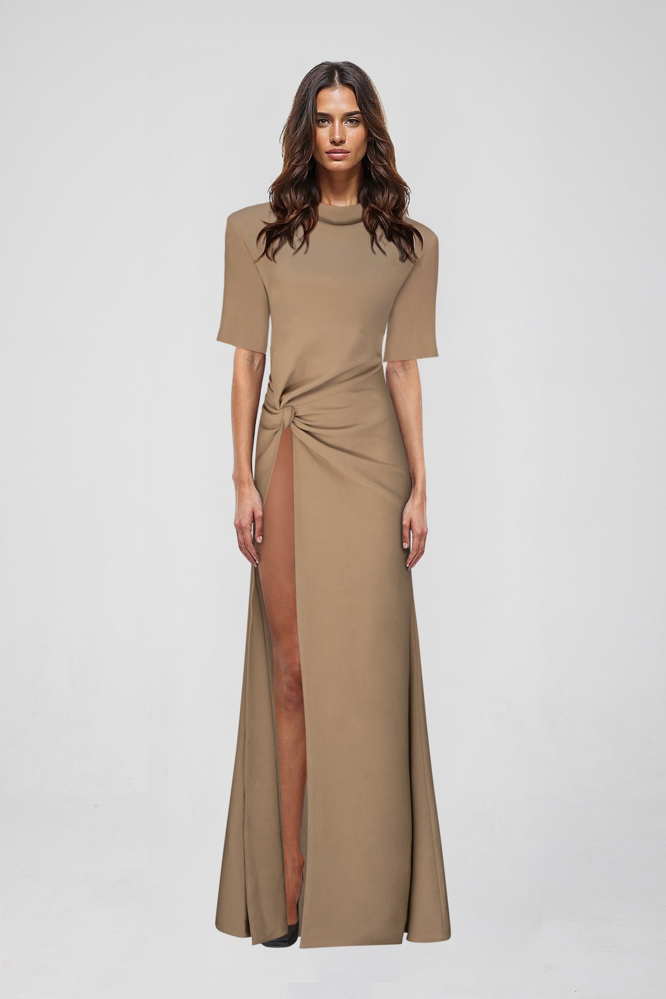 The Raya Maxi has arrived in a minimalist latte colour way for a utilitarian take on the gown of the season. This style features a dramatic floor length hem and oversized shoulder pads. An exaggerated split hem opens up to the top of the thigh where a knot detail is placed for a comfortable and flattering wear. Styled down with a pair of flats or elevated with a heel, the Raya is a versatile and timeless statement piece.