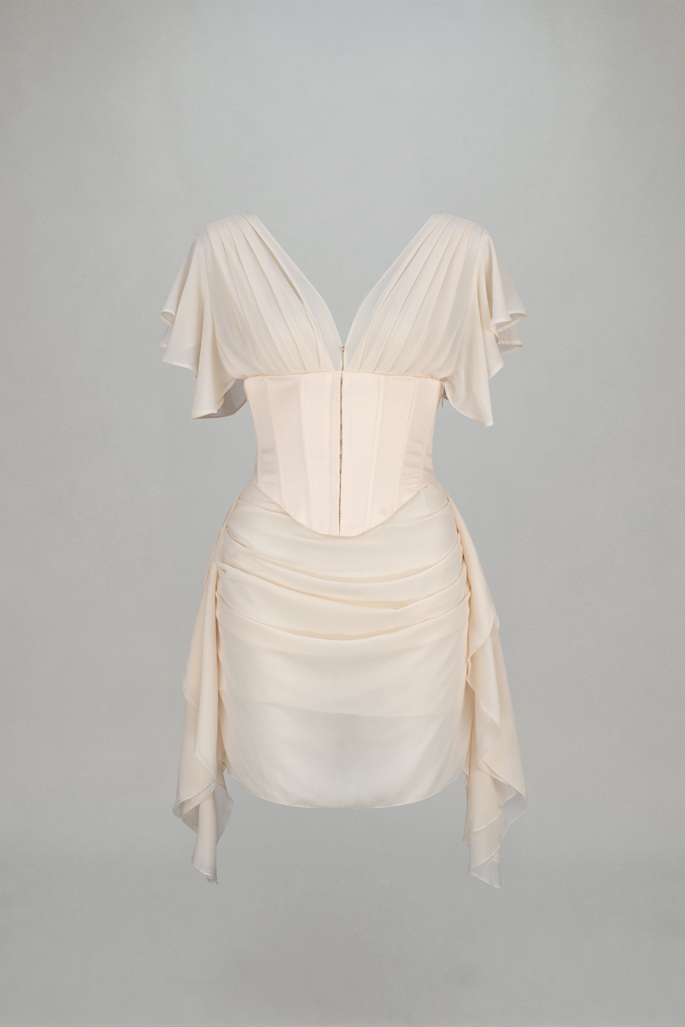 The Romee Mini arrives in an ethereal ivory, constructed from a soft chiffon base with contrast satin corset detailing at the waist. An invisible zip closure and lightweight lining creates an ease of wear.