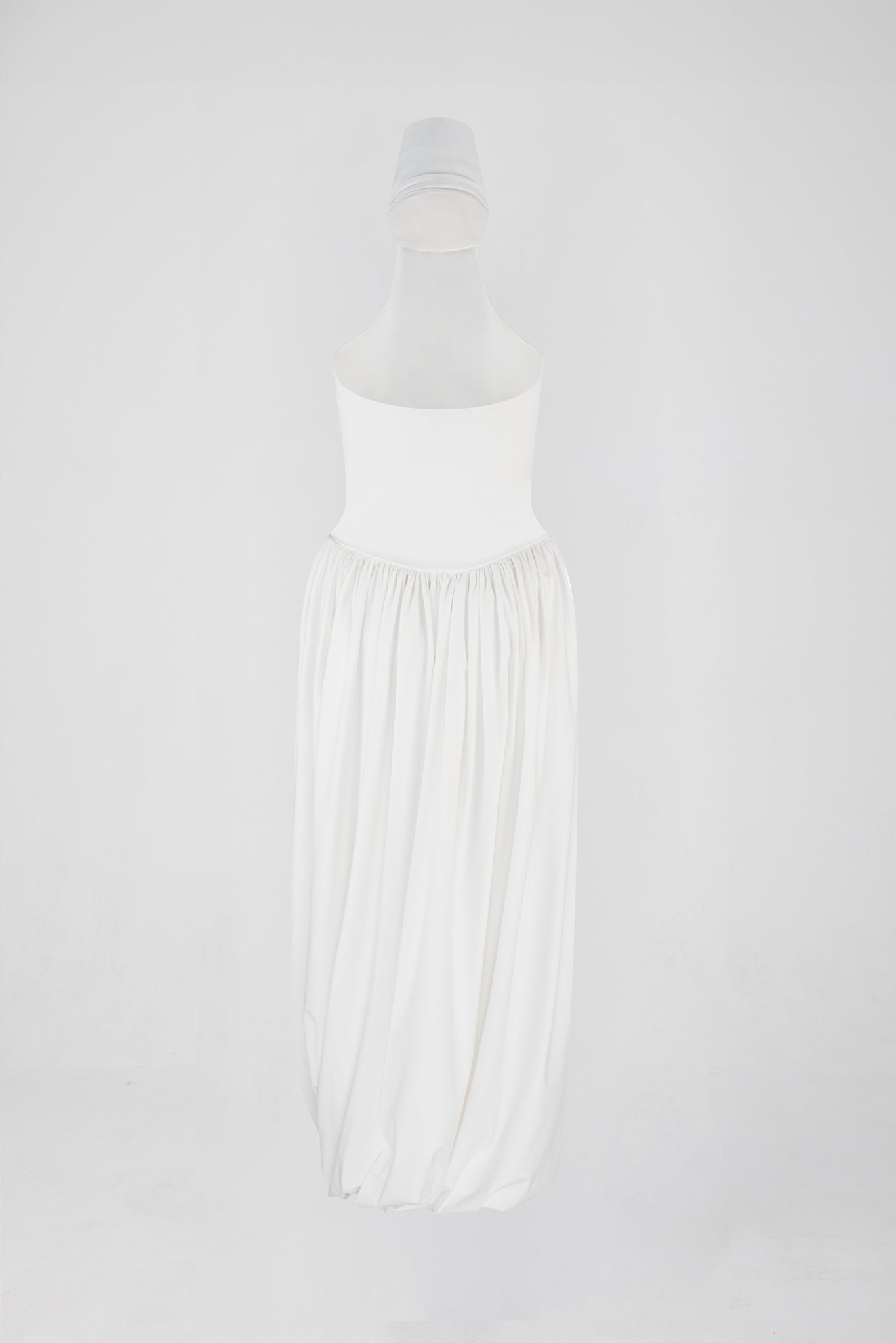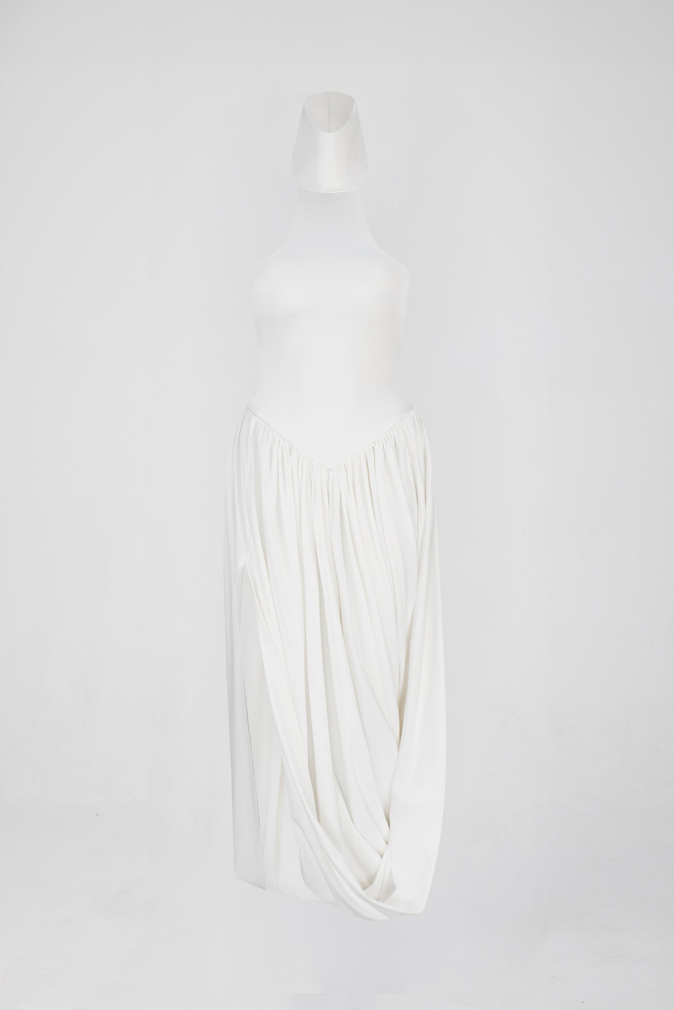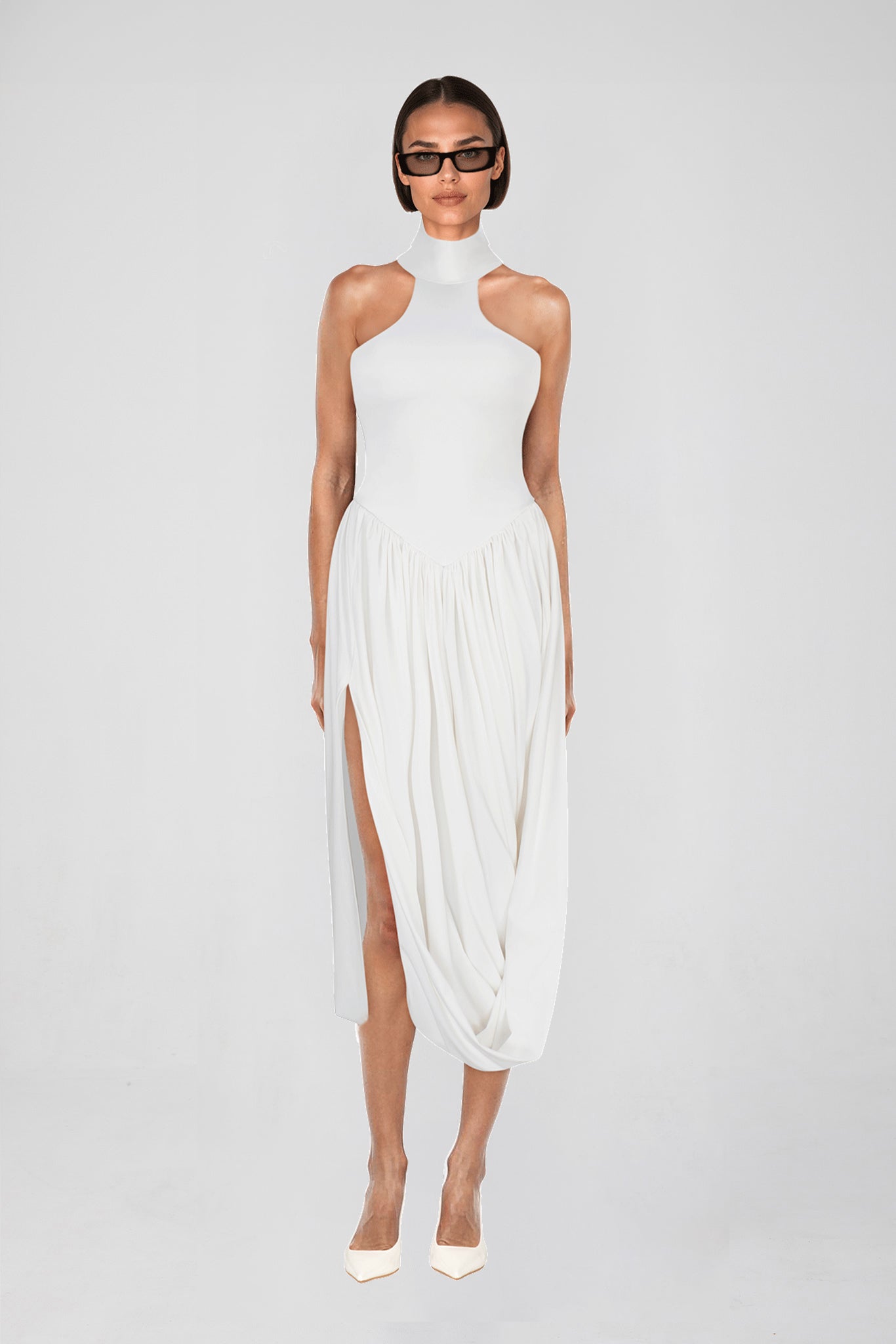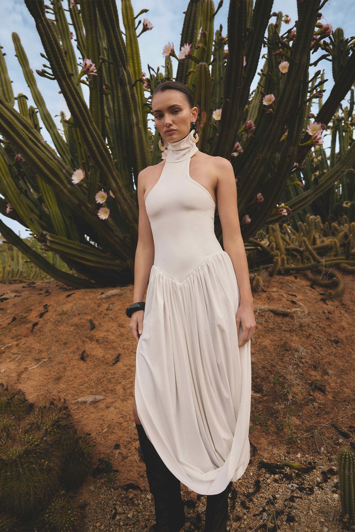 The Sloane Midi has been designed into a luxe, stretch fabrication with a halter neck line featuring an exaggerated turtle neck collar band. A racer front silhouette across the bust contrasts the femininity of the draped skirt.