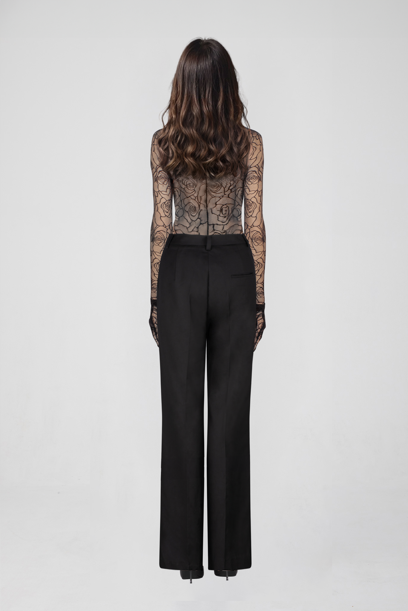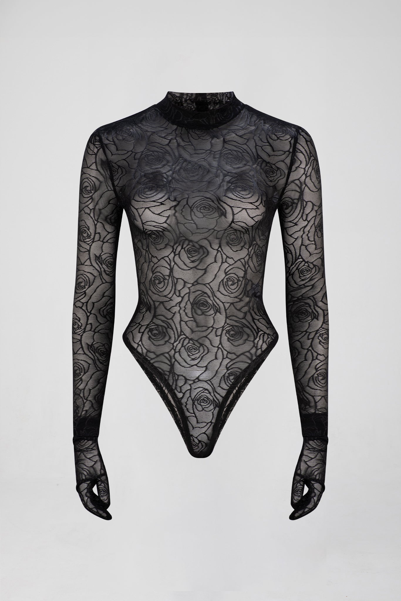 The Syla Bodysuit has been designed in to a stretch-mesh fabrication. Featuring high-cut hips, a snap button closure and matching gloves to elongate the silhouette.